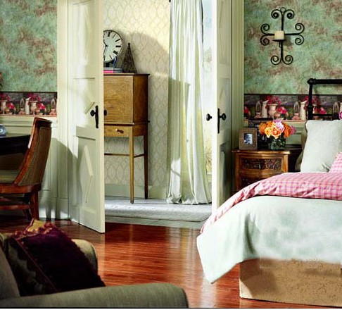 布藝:單是一面墻壁使用了壁紙,自然會顯得很突兀。注意在靠包和腳凳等小面積的面料選擇方面與之相呼應。布料的花型比例大小應與壁紙相當,在顏色方面也要保持一致。