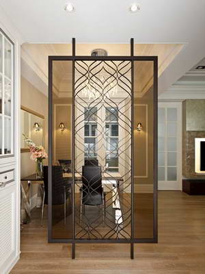 從這個(gè)面看餐廳有點(diǎn)兒若隱若現(xiàn),這要?dú)w功于這一款鐵藝的玻璃屏風(fēng)了。玄關(guān)處與餐廳間擺放這樣一個(gè)做工精美的陋斷,既不影響空間又能做到拉高層次,壁面則以仿布板壁紙和畫框境搭配,華麗的吊燈反射出放大空間的效果。