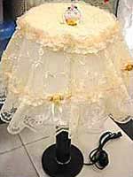 在某布藝店內(nèi),擺滿了蕾絲紗或蕾絲布的窗簾、可愛(ài)的洋娃娃、色彩豐富的臺(tái)燈飾品,還有各式各樣的玩藝兒,像西式燈、籃子、儲(chǔ)物箱……給人帶來(lái)浪漫和驚喜。在家中玄關(guān)處擺放一面蕾絲花邊的鏡子,出門前梳理整齊,既美觀又實(shí)用??茨莻€(gè)披上外衣的化妝盒在嬌滴滴地向你撒嬌。有蕾絲花邊的燈飾體現(xiàn)華麗風(fēng)情,最適合在客廳擺放,尤其是搭配布藝的沙發(fā)。這里的蕾絲西式燈罩都是精工制作,每件都好像在量身定做宮廷禮服,直立的燈飾也好似正要參加宮廷舞會(huì)的貴族,這樣的燈飾為客廳增色不少。