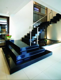 設(shè)計(jì)師還充分利用梯下約3平方米的邊角空間,用與梯級(jí)材質(zhì)一致的黑色大理石精心砌造了一個(gè)棱角分明的小水池。陳太太在水上精心布置了漂浮的白色蝴蝶蘭花朵,當(dāng)水池四周的射燈亮起時(shí),水中光影跳躍,暗香浮動(dòng),給整個(gè)居室增添了不少靈氣。