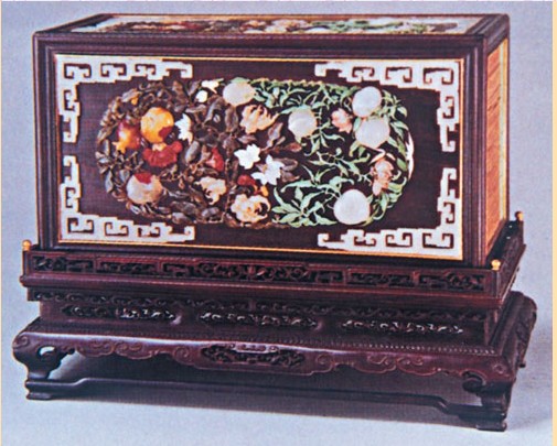 這是一件用于存放糖果類食品的果盒。在清宮珍藏的帝后生活用品里,這件果盒以精湛的制作工藝、豐富的百寶嵌裝飾技法而得名。此盒為清代乾隆年間所制,紫檀盒的口徑長27.5厘米,寬22厘米,長方圓角形,通體以金星紫檀木制成,盒面上鑲嵌著藕、蓮蓬、茨茹、白菊、黃菊、芙蓉、蘭花等各色花果一簇,與盒內(nèi)放置的瓜子糖果等時(shí)令果品恰成交相輝映的特殊效果。盒面花果的稿本取自繪畫,但其效果卻遠(yuǎn)勝于繪畫,極富立體感。從藕的選料可以看出制作手法的高超,藕身用白玉,但露孔處的剖面則用螺鈿,雖然同是白色,而螺鈿的亮度和白玉不同,這就顯出藕身皮色、剖面則白色有水意的逼真效果。再有同是綠色,蓮蓬用碧玉,而菊葉用孔雀石,又出現(xiàn)不同的質(zhì)感;盒面上的蘭花采用青玉為料,紅果使用紅瑪瑙,突出了這兩種花果各自的特點(diǎn)。由于這件百寶嵌花果盒采用五彩奪目的玉石螺甸作裝飾,再加之紫檀木那種木質(zhì)深沉的紋理來襯托,更使這件用于盛放食品的普通容器增色不少,正如清人李漁《閑情偶記》中所說:“粗用之物,制度果精,入于王侯之家,亦可同乎玩好?!?/P>