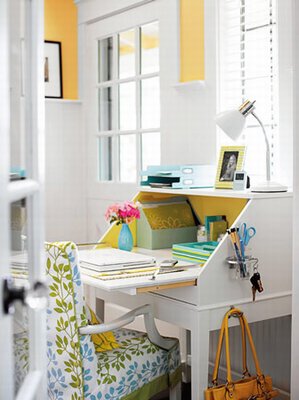 聰明女人的辦公桌一定是整齊而多功能的,這里可以掛起你的錢(qián)包或者公文包,處理電子郵件,把第二天要帶去公司的文件擱在這里,出門(mén)的時(shí)候也一定不會(huì)忘記。頂層的文件盒也是最明顯的地方,裝一些你想看得見(jiàn)、記得帶的東西,比如需要郵寄的信件。下面的文件夾裝一些經(jīng)常處理的文件,比如賬單。桌面上的托盤(pán)盒裝手機(jī)、ipod等小物件,盒子外圍可以用絲帶稍微點(diǎn)綴一下。桌子側(cè)翼用來(lái)放筆的牙缸架和掛鑰匙的S形鐵鉤功不可沒(méi),而桌邊掛衣鉤的出現(xiàn)讓手包和公文包在使用時(shí)垂手可得。