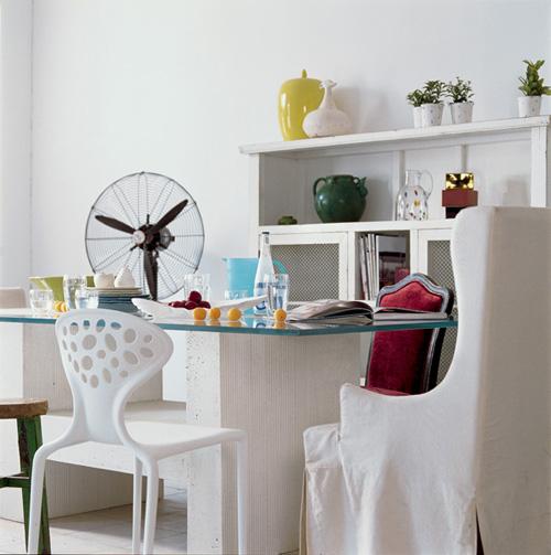 在這個以老式電扇、古典的絳紅絨面座椅以及略顯斑駁的白色櫥柜為主體家具的餐廳中,搭配簡潔的白色玻璃面餐桌、現(xiàn)代感十足的白色單椅和色彩明快的餐具與飾品,形成清爽、質(zhì)樸的懷舊氣息。
