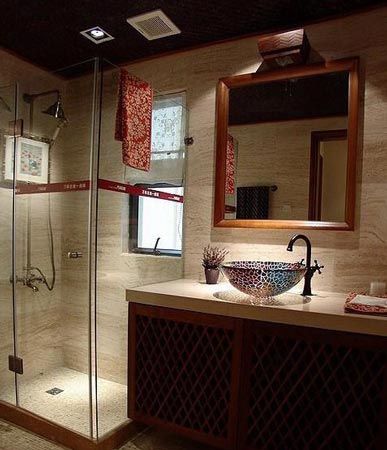 這款衛(wèi)生間設(shè)計(jì)非常大膽,本來(lái)是想做半敞開(kāi)式,后來(lái)經(jīng)過(guò)修改,將馬桶單獨(dú)隔了一起來(lái),將洗手臺(tái)放在外面,類(lèi)似公共場(chǎng)合。由于相連的空間是游戲室,還擺放了一張麻將臺(tái)子、為了整理美觀考慮,在這間加了一道從頂而下的簾子,絲毫沒(méi)有突兀的感覺(jué)。