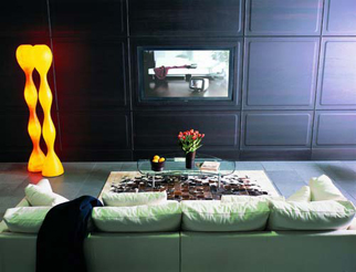 客廳中,大徑深、舒適型沙發(fā)本來就很搶人眼球,加上帶有灰調(diào)的紅作為底色,配以大朵紅色團花面料,在燈光的照射下,整個客廳給人以驚艷的感覺。如果,夫妻二人喜歡艷麗環(huán)境,可以采用這種方式裝飾客廳。沒事的時候躺在沙發(fā)上,聽音樂、看書、和愛人聊天,再來杯紅酒,實在是件愜意的事情。