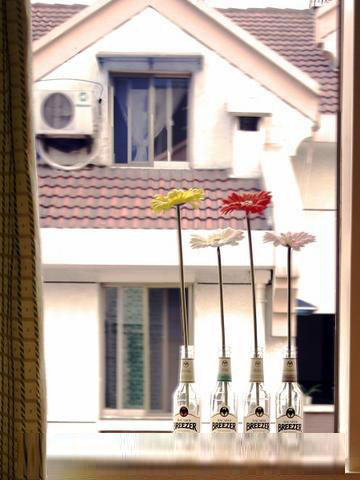 插花的瓶子是上回和朋友K歌時(shí),喝剩下的,覺得還漂亮,就帶回了家。