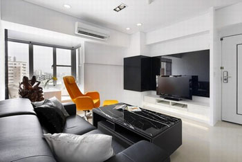 而設(shè)計師做的第一件事,就是打掉內(nèi)部隔間墻,保留兩房兩廳空間,放大的空間坪數(shù)奠定大器敞朗的簡約住家基石。依照屋主喜歡且設(shè)計師擅長的黑白意象,設(shè)計師利用烤漆玻璃、系統(tǒng)柜、拋光石英磚在色彩上做簡單的變化,主要是利用不同材質(zhì)的介面營造空間層次感,加大空間視感。