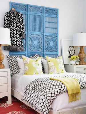 4、竹制的屏風噴上了淺藍色,代替了原來的床頭板,并且讓視線上延,強調(diào)了房間天花板的高度。