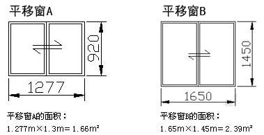 平移窗A的高度為0.92m,不足1.3m,要按1.3m計算面積;平移窗B的高度超出1.3m,就按實際尺寸計算面積。而一組推拉平移窗是單個窗口,它們的面積均超過1m2,所以會按實際面積計價。