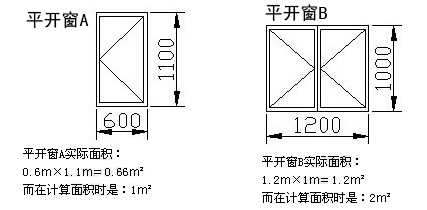 平開窗是按開出1扇窗1m2計算,平開窗A的面積為0.66 m2,不足1m2,按1m2計算。平開窗B實際上是算2扇平開窗,因此算2m2。