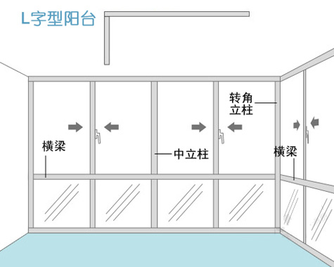 (多數(shù)L字型陽臺窗有1根中立柱、2根橫梁、1根轉(zhuǎn)角立柱,中立柱數(shù)量也根據(jù)陽臺具體尺寸來定。)