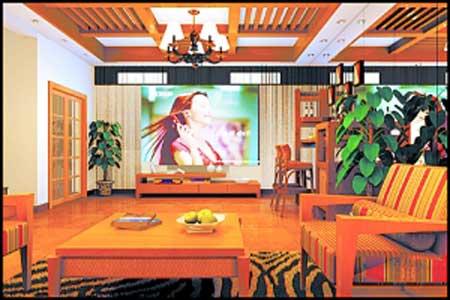 客廳與休閑室之間的墻中間被掏了一個(gè)方形洞,洞四周用木框包邊,做成窗戶(hù)的樣子。而客廳的電視機(jī)就放在窗戶(hù)上,給人的感覺(jué)是一面電視墻。在這個(gè)大窗框后面就是休閑室的墻,建議墻上用大幅山水畫(huà)或油畫(huà),在室內(nèi)營(yíng)造一幅藝術(shù)美景。裝飾裝修