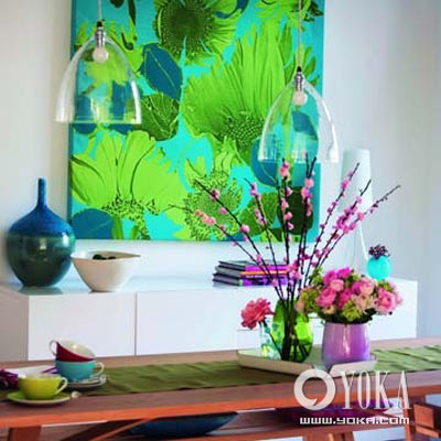 1.大的帆布畫,淡綠色和水藍(lán)色形成鮮明對比,給整個(gè)空間以視覺沖擊。