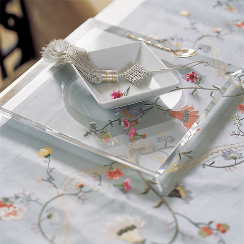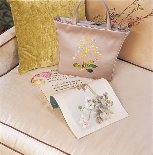絨布的椅背圍著木條交織的東方圖騰,墻邊置物柜上的圓環(huán)里框著小件的自然雕塑品,長(zhǎng)方燈上排著高矮相間的深淺酒杯,玻璃壓著的是絲綢料上典雅的手工刺繡,亮白瓷盤里放的是精巧手編的粉色中國(guó)結(jié)。