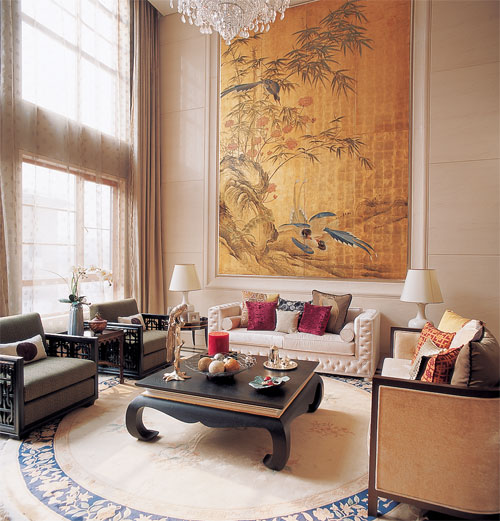 室外日光無聲地透過落地窗紗,灑在巨幅淡雅的花鳥畫上,畫里底色透著貴氣的金,呼應(yīng)的是天花頂垂下的晶瑩剔透的水晶吊燈,暗示著西洋皇室的華麗。
