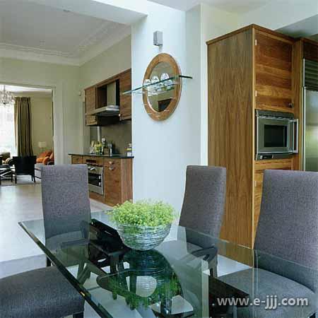 光滑的玻璃餐桌,精致而又明亮,深灰色的椅子成了這間開放廚房的焦點。桌上配上點綠色的小植物來裝飾,生氣和活力都有了,全家人在這里享用一頓晚餐,肯定相當溫馨。