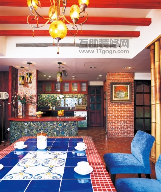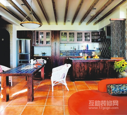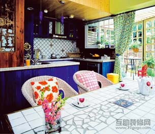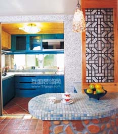 將廚房外的墻面整理出一陽(yáng)臺(tái),使廚房的空間不但光源充足,且視覺(jué)空間也可從廚房延展至餐廳及陽(yáng)臺(tái),搭配慣用的磁磚拼貼流理臺(tái)及中島型吧臺(tái)桌、餐桌,并大膽用印度藍(lán)染色方式處理木柜門面,并用窗欞做廚房隔屏,使整個(gè)空間營(yíng)造出帶點(diǎn)中國(guó)風(fēng)的地中海風(fēng)格。