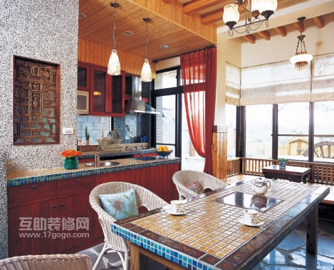概要: 抱持「只要廚房空間美,任何人都會(huì)想在這空間大顯身手」的設(shè)計(jì)想法,設(shè)計(jì)師大膽地將國(guó)畫陶磚嵌在爐具臺(tái)面的壁面、將中國(guó)窗欞做成隔屏在吧臺(tái)上與廚房做視覺(jué)區(qū)隔、將各式各樣的磁磚拼貼在操作臺(tái)面上或餐桌臺(tái)面上、具有特色的燈具設(shè)計(jì)…等等。