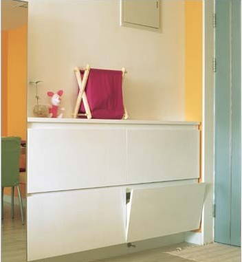有些房型的玄關(guān)由于空間太小,很難設(shè)計(jì),怎么辦?在這樣的玄關(guān)中,將鞋柜設(shè)計(jì)成緊湊型便是很好的創(chuàng)意。在狹小的空間里,安裝一個(gè)懸掛式的鞋柜,柜體非常薄,僅僅是一雙鞋的寬度,這樣做既節(jié)約了空間又注重了實(shí)用性。