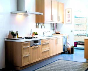 單排式廚房就是將所有的電器和櫥柜都沿著一面墻壁放置。也就是說,將工作三區(qū)域安排在一條直線上進(jìn)行。這種緊湊、有效的窄廚房設(shè)計(jì)非常適合中小家庭或者同一時(shí)間只有一個(gè)人在廚房工作的住房。如果在大廚房運(yùn)用這種設(shè)計(jì),就可能造成不同功能之間的距離太大。