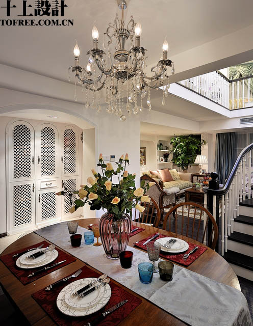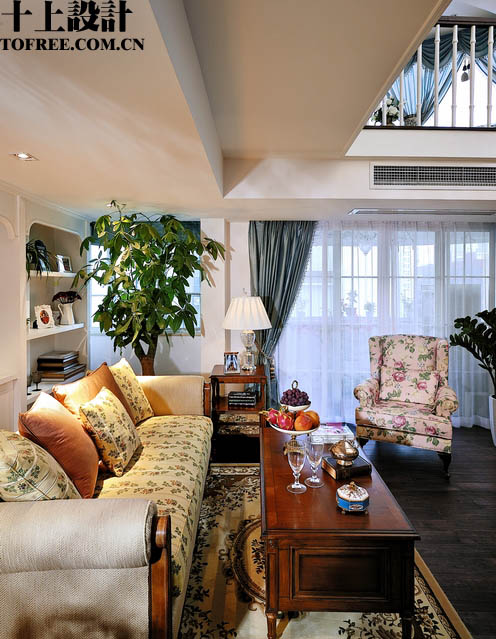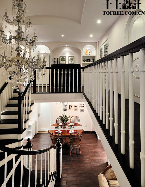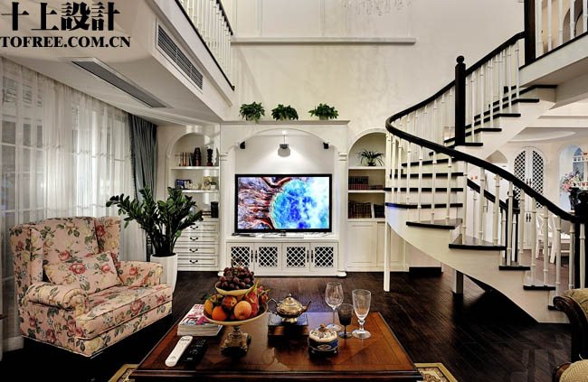 現(xiàn)在看主要的一面,這邊也是原先布滿了建筑管道,我們把中間的客廳的上空打掉,人工做了一個漂亮的高廳,也利用這個高廳,將樓梯巧妙的安置在這個區(qū)域,又可以形成景觀,又不占面積