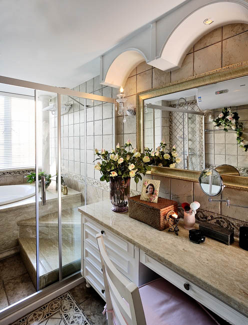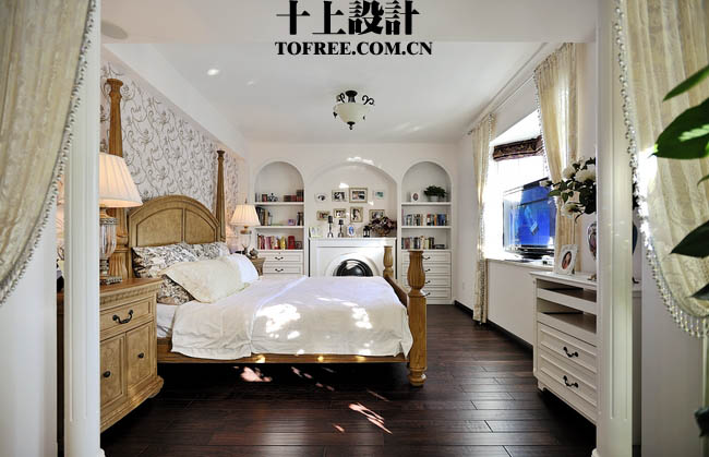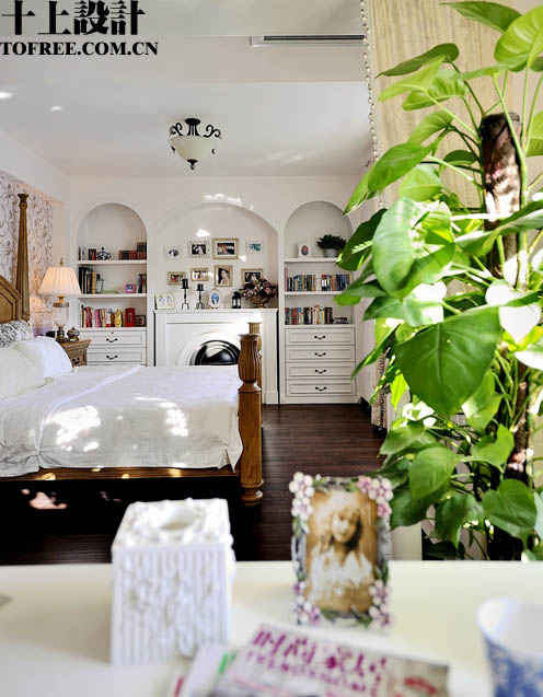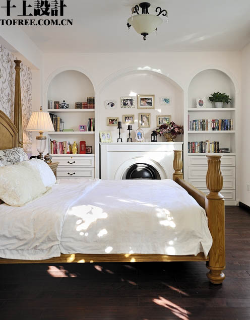 現(xiàn)在換一個角度看主臥,呵呵,盡頭也是一個裝飾柜,所不同的是中間造型做了一個壁爐,冬天取暖很舒服的