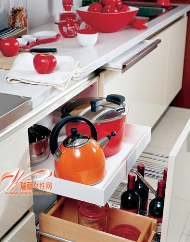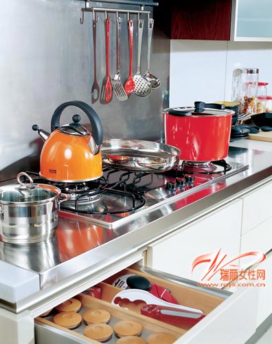 家人團聚性的聚餐,自然需要各式各樣的佐餐飲料,如果對酒水的需求量比較大,可先把一部分酒水暫時儲放在櫥柜里,等需要時再取出來。好看的烹飪器具更換彩色炊具擴張喜慶感如果是餐廚一體的就餐空間,烹飪器具一定要在新的一年來臨時打理干凈,或者添置一些新的彩色炊具和各式紅色廚房小五金件。節(jié)日里,它們讓冰冷感覺的烹飪區(qū)也活躍、熱鬧起來。上海裝潢網