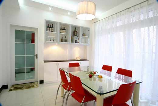 餐廳的設(shè)計(jì)風(fēng)格除考慮跟整個(gè)居室的風(fēng)格相一致外,氛圍上還應(yīng)把握親切、淡雅、溫暖、清新的原則,假如餐廳面積較小,可考慮在餐桌靠墻的一面裝上大的墻鏡,既增強(qiáng)了視覺(jué)通透感,又通過(guò)反光使居室顯得明亮,整個(gè)空間也就感覺(jué)開(kāi)闊了許多。