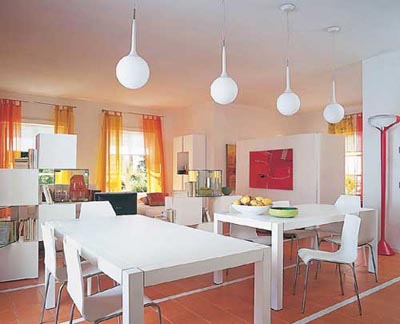 在起居室,你可以運用不同光源的組合變化,依照自己的需要,創(chuàng)造出溫暖的氣氛或戲劇性的效果。最常被用來懸掛吊燈的地方通常是被用來款待賓客與家庭聚餐的用餐區(qū)間。最好是選擇那種可以調(diào)整高度的吊燈,如此一來,才能在招待朋友聚餐時,于餐桌上制造出親密的氛圍。然而,同時也必須考量它在一般時候的照明效果。