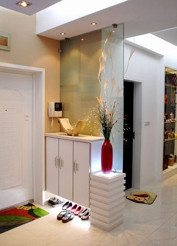 玄關(guān)一般與廳相連,由于功能不同,需調(diào)度裝飾手段加以分割,或吊頂、墻面、地面的形狀、色彩、材質(zhì)不同;或用門套、掛落、隔斷、屏風、櫥柜相隔。在平面關(guān)系上,玄關(guān)與廳應(yīng)當連而不直達、隔而不斷。