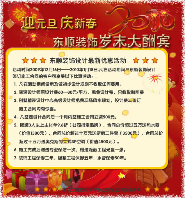 喜迎雙節(jié),各獲豐收,東順裝飾為了答謝新老客戶對(duì)東順裝飾的支持與厚愛,在新春佳節(jié)來臨之際,特推出“迎元旦賀新春”的大酬賓活動(dòng),還有更多驚喜等著您!