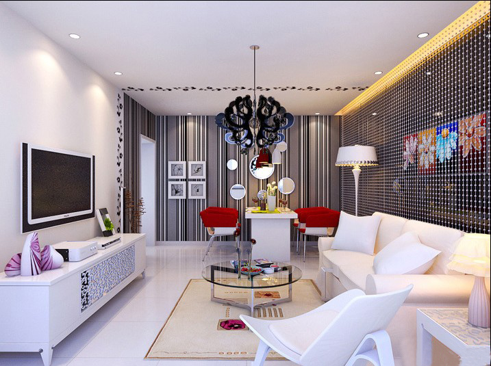 由于空間有限的緣故,客廳和餐廳自然是合二為一的??蛷d是家中最主要的活動(dòng)區(qū)域,它應(yīng)該寬敞、方便。利用大量的烤漆玻璃和白色的家具,讓整個(gè)空間在視覺圣桑變得實(shí)際上大很多。背景墻采用深色系,同白色相呼應(yīng),空間也得到拉升的效果。