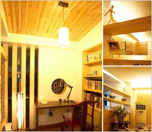 書(shū)房,運(yùn)用了暖洋洋的土黃色。書(shū)房和客廳是敞開(kāi)相連的,隔斷將遮未遮,擴(kuò)大了空間感還能滲出一絲文化香,書(shū)桌正對(duì)面中式圓形窗,更是多了通透感。