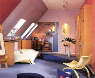 閣樓的最低點(diǎn)是個(gè)不方便進(jìn)出的地方,本案卻利用這個(gè)角落,設(shè)置了一組開放式展架。元洲裝飾公司設(shè)計(jì)師胡遠(yuǎn)在談及閣樓設(shè)計(jì)的經(jīng)驗(yàn)時(shí)稱,不規(guī)則的立面也可以全面利用,設(shè)成一面墻的柜子,但是,一定要融合美學(xué)的因素,柜門設(shè)計(jì)的可以有韻律感,也可以不規(guī)則,而且在色彩、材質(zhì)上大膽變化,此外,面對(duì)復(fù)雜的空間結(jié)構(gòu),盡量簡(jiǎn)化處理,選用合理的燈光劃分成不同區(qū)域,以達(dá)到靈活分割空間的目的。如果睡床的頂上有大梁,應(yīng)該采用局部吊頂,把這種對(duì)人有壓迫性的結(jié)構(gòu)化解,以獲得舒適的居家感覺。在配飾上采用柔軟的紗質(zhì)材料,配以不同燈光,造成溫暖柔和的居住空間。
