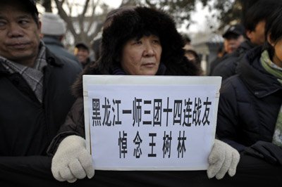 王樹(shù)林曾經(jīng)所在的黑龍江兵團(tuán)的戰(zhàn)友今天也來(lái)到送別儀式現(xiàn)場(chǎng),他們打著“黑龍江兵團(tuán)戰(zhàn)友泣送王樹(shù)林”、“兄弟一路走好”的橫幅,高喊著“王樹(shù)林一路走好”,幾位女士流下了熱淚。
