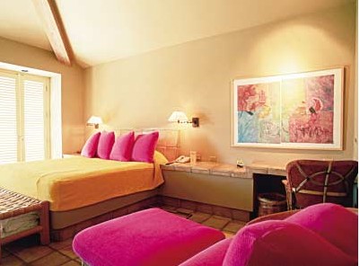 在色輪上找一個你最有感覺的紫色,那么與它相鄰的紫紅色和藍紫色都是它的協(xié)調色。如果再加上這三個顏色還有不同深淺的明度,你就可以在眾多協(xié)調色中找到最舒服的方案。在這個方案里,屬于基礎部分的墻壁、床蓋和靠枕都是紫色,只不過明度都很淺。而布藝床頭和長毛批毯分別是紫紅色和藍紫色。當大的用色環(huán)境被定格后,那些條紋靠墊,裝飾畫和花瓶等各種用品都會圍繞這個原則,深深淺淺地穿插在各個角落里。