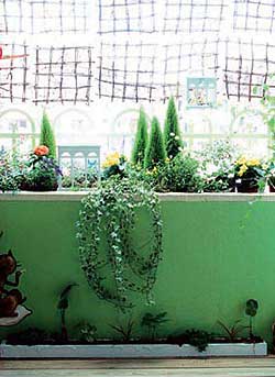 在陽臺上種花栽草也要有巧妙的搭配,否則其效果就會像野草一樣雜亂無章。陽臺的花草園地,既要便于澆水和管理,又要使各種花卉都能充分吸收到陽光。花草的放置也有訣竅,通常有鑲嵌式、垂掛式、階梯式和自然式四種。“鑲嵌式”一般用在已經(jīng)裝修而且面積較小的陽臺上,利用墻壁鑲嵌特制的半邊花瓶式花盆,然后栽種觀葉植物?!按箳焓健笔怯眯∏删碌娜萜髟苑N吊蘭等小型植物,然后懸掛在陽臺頂板上。也可栽植藤蔓或其他有纏繞能力的觀葉植物懸掛在陽臺外?!半A梯式”是在陽臺內(nèi)搭起階梯,進(jìn)行立體盆花布置,一般的植物都可利用這種形式栽培?!白匀皇健崩藐柵_外的盆架栽種一些木本藤蔓植物,使植物自然下垂,形成一種自然景觀。