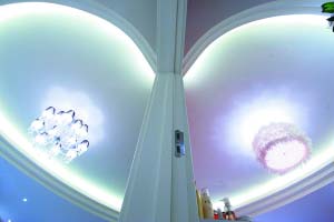臥室和客廳兩個空間的天花板上,分別有一半心形的造型,組合在一起就是一個完整的“心”,將浪漫一直延續(xù)到了天花板上。睡在床上,躺在沙發(fā)上,只要一抬頭,就能感受到濃濃的愛意。
