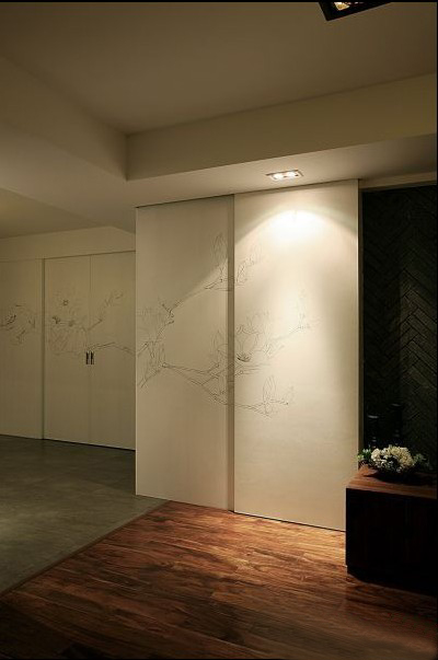 從餐廳里看不出這個家到底采用哪種風格?;蛟S餐桌上方的中國風十足的吊燈隱隱現出這是個中式風格。壁櫥上簡潔的圖案,雅致非常。
