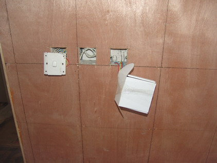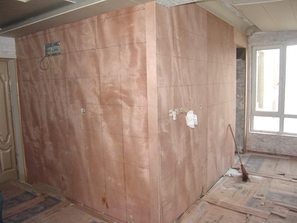 這是玄關(guān)至餐廳的拐角處,由于今后要鋪設(shè)烤漆玻璃,所以,木工師傅采用了大塊木板做基層,確保了其牢固度。我們在所有基層的制作上一定是力求安全、到位。