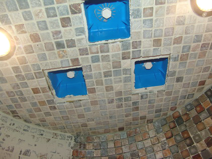 沐浴房安裝的嵌入式花灑是在鋪貼馬賽克之后,師傅們在鋪貼工作中細(xì)致地劃分區(qū)域預(yù)留位置。
