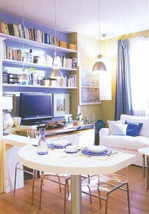 在這35平方米空間里可說是五臟俱全。一張餐桌、六把餐椅,占據(jù)了客廳的所有活動空間,但有了可伸縮的餐桌,在不聚餐的時候,客廳里的活動空間可被完整地還原。金屬結(jié)構(gòu)、橡木臺面的餐桌搭配半透明水晶外殼的椅子,布置出簡潔的就餐領(lǐng)地。準(zhǔn)備若干把可折疊的椅子是必要,方便就餐客人人數(shù)的增減。白色的桌布、藍(lán)白兩色的餐具干凈清爽??臻g雖小,與朋友相聚的快樂卻一點(diǎn)都不會減少。